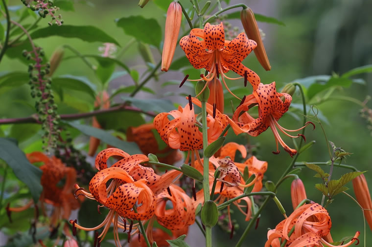 この花も鮮やかです。真夏を象徴する花です。 花弁はオレンジ色、濃褐色で暗紫色の斑点があり花弁は強く反り返ります。