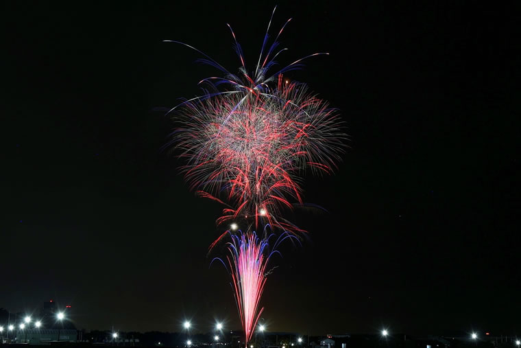昨年は“海の公園”内から花火を撮影したのですが、やや近すぎて、カメラ画角に花火を納めるのが難しかったので、今回は打上げ場所から約1km離れた場所から撮りました。