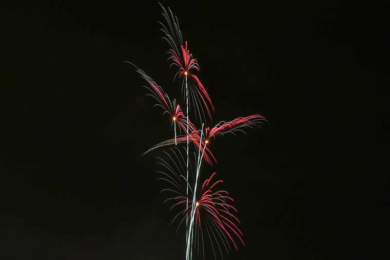 花火を肉眼で見ているときは、その一瞬一瞬の光景を見ていますが、バルブ撮影の写真ではシャッターを開けている間の光景が重なって撮影されます。