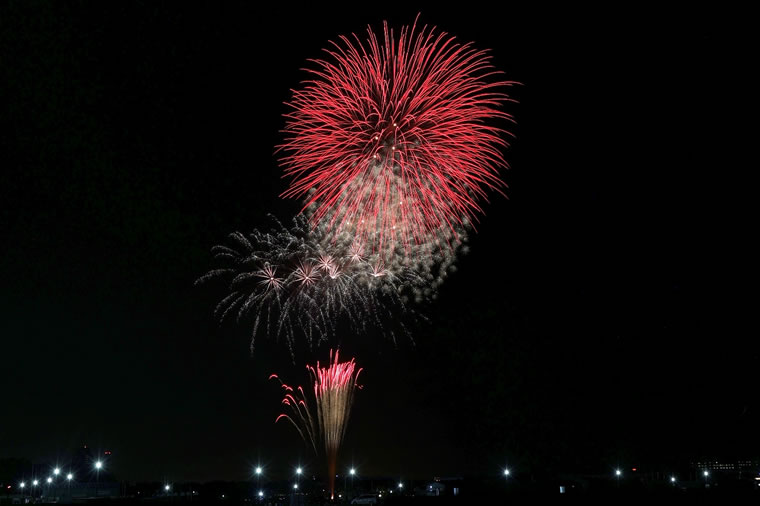 風が強かったため、花火が流され、打ち上げ場所と一番上の赤い花火の開花場所が結構ずれました。