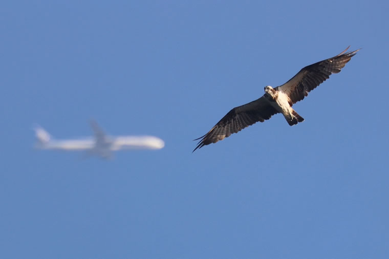 飛んでいるミサゴをカメラのファインダー越しに追いかけていると、飛行機が画角に入ってきました。