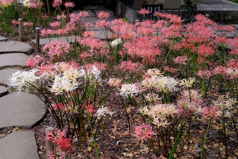 お寺の入口から門までは真っ赤、黄色、白の3色彼岸花でしたが、階段を上って門をくぐると、ピンクリコリス(彼岸花)が迎えてくれました。