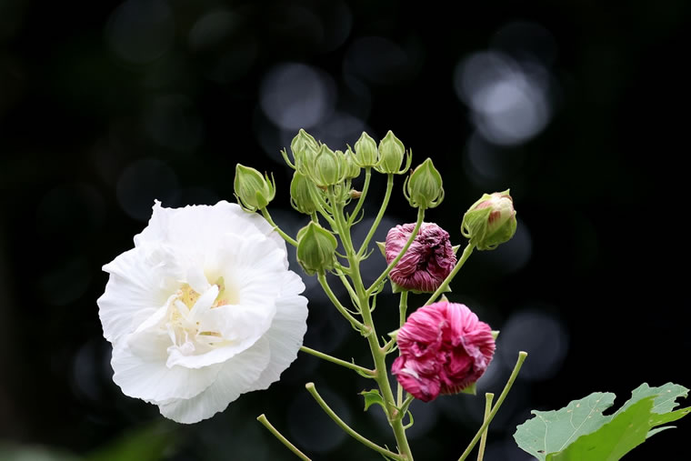 酔芙蓉は、一日の間に白花も赤花も見ることが出来る不思議な花木です。蕾の時は赤に近い濃いピンクで、朝に白い花を咲かせます。お昼には優しいピンク色になり、夕方には濃いピンクになり、その後は萎んでポトリと落ちます。