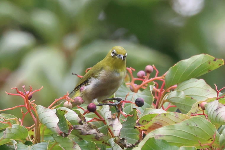 エゾビタキが好きなミズキの実を、メジロが食べに来ていました。