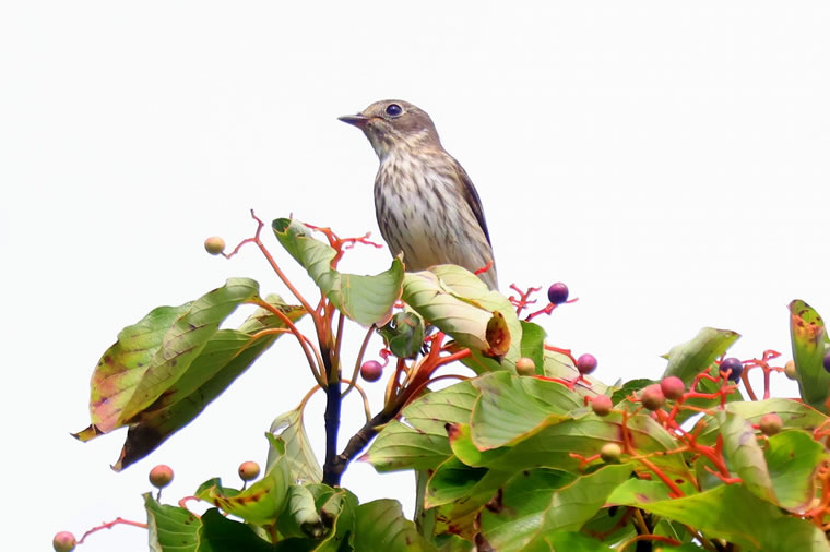 エゾビタキはスズメより少し小さく、腹面には暗褐色の縦縞が明瞭にならんでいるのが特徴です。