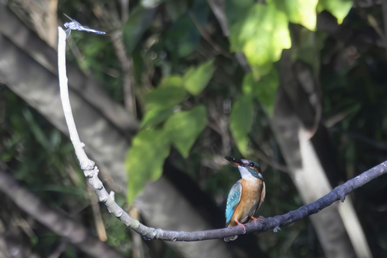 お母さんカワセミが枝に留まって、幼鳥にあげる小魚を探していると、枝先にシオカラトンボが留まりました。