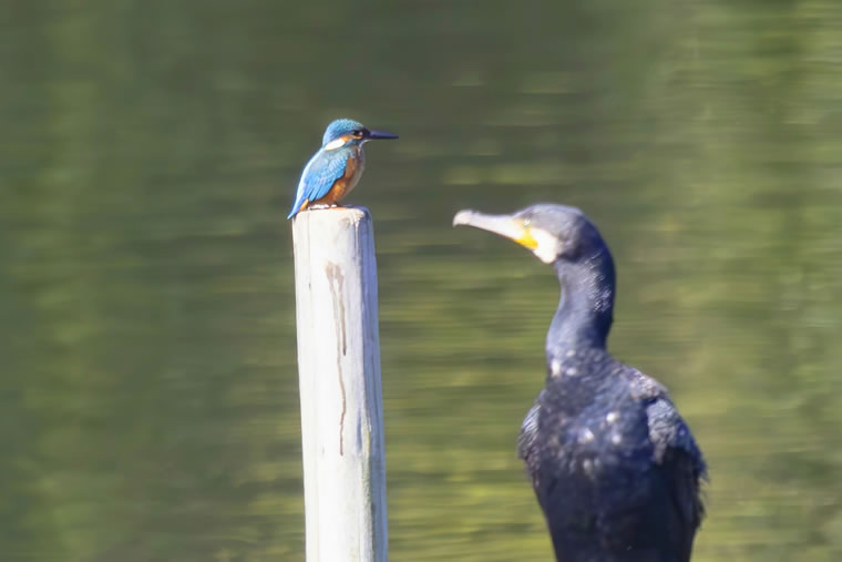 高さが違う杭の上にカワセミとカワウが留まり、目線が同じ高さになりました。