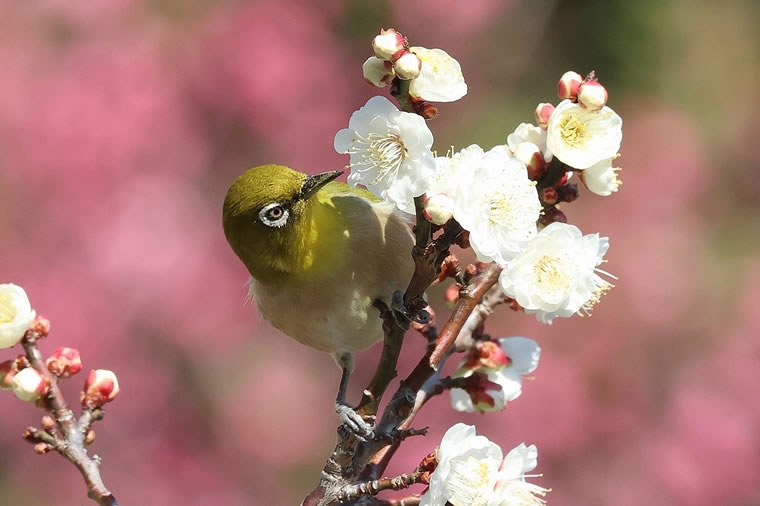これも白梅とメジロですが、背景のピンクは紅梅です。