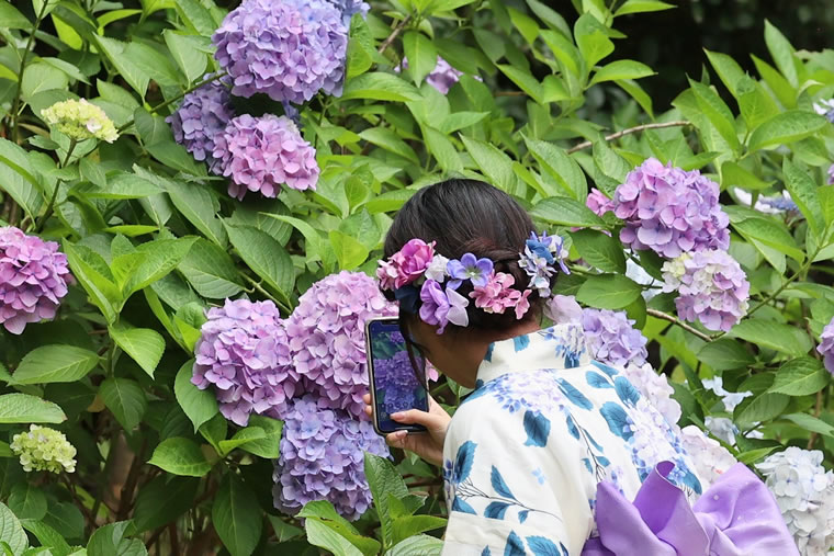 アジサイの分身かと思うほど、髪飾り、浴衣がアジサイのようで、あまりの美しいお嬢さんの後ろ姿を撮らせてもらいました。