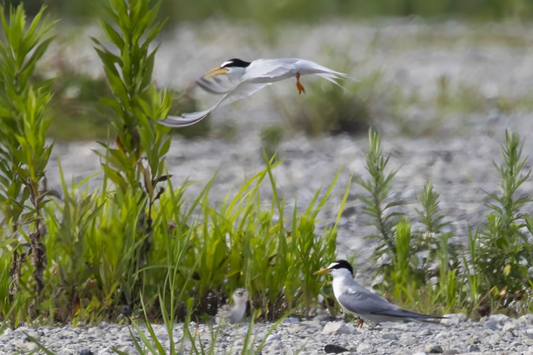 まずは、コアジサシ。 2羽のカッブルが交代で、雛(画面下の中央)に小魚を運んでいました。