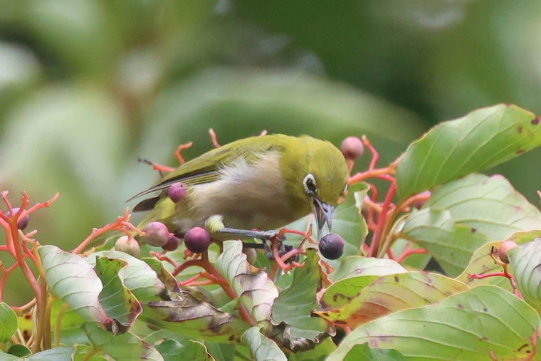 エゾビタキの好物ミであるミズキの実を、メジロもおいしそうに啄んでいました。