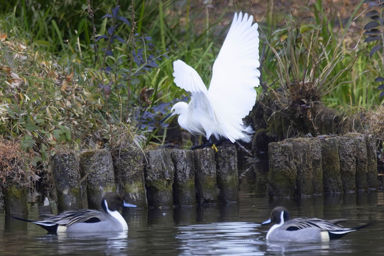 境内の池にいた、コサギとオナガガモです。 のどかなひと時でした。