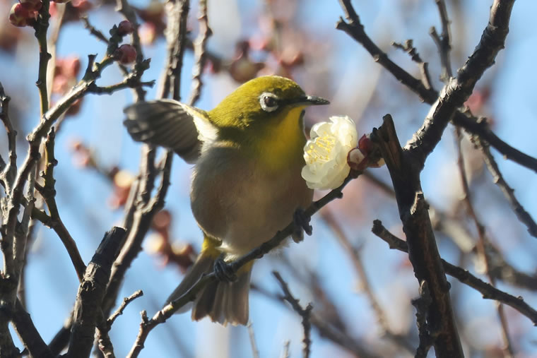 気温が高くなってきたので、今日こそは梅にメジロがやってくるかも!と思って出かけました。 正解でした!!