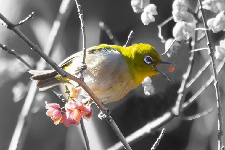 メジロ回りをカラーにして、周辺はモノクロにしてみました。