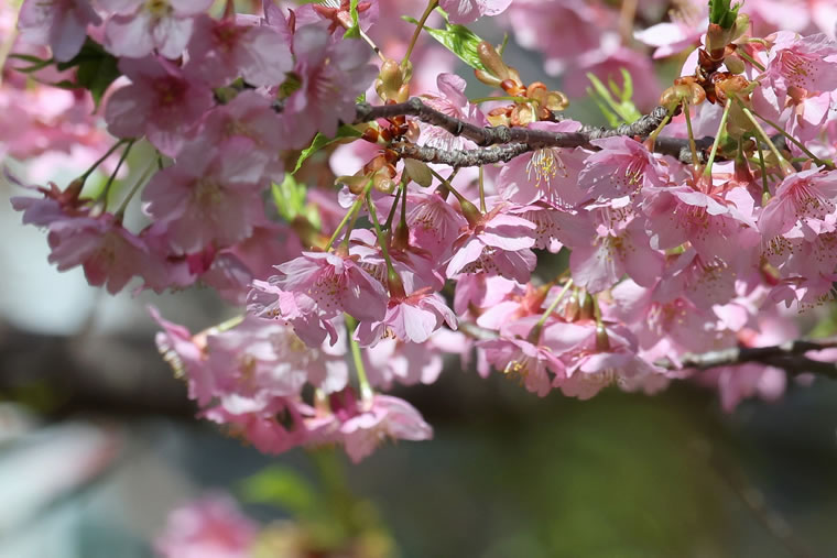 色鮮やかな河津桜を見つけると、通りがかりの人は足を止め、携帯で写真を撮っていました。