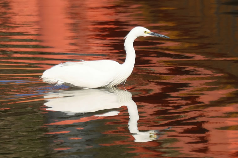 コサギが池の中で獲物を探して移動していました。