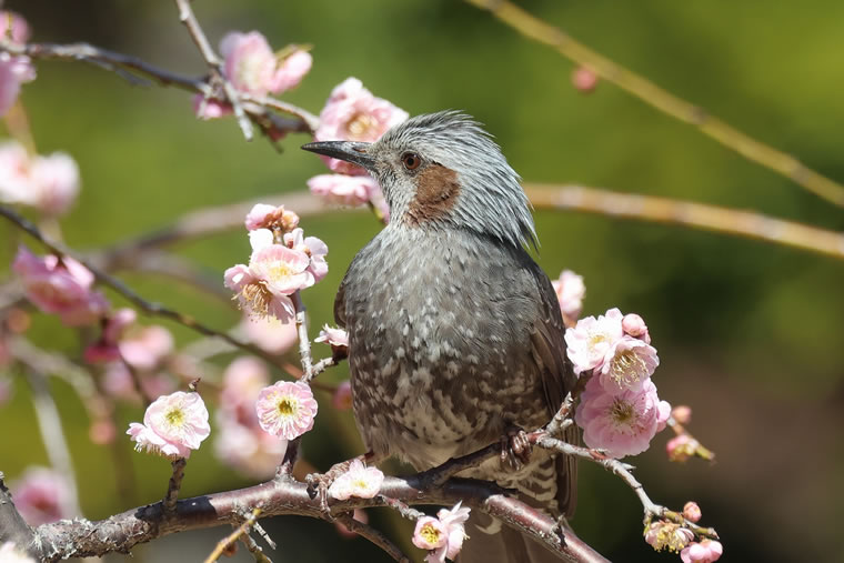 遅めに咲いたしだれ梅にやってきたヒヨドリさん、木についている虫を盛んに啄んでいました。