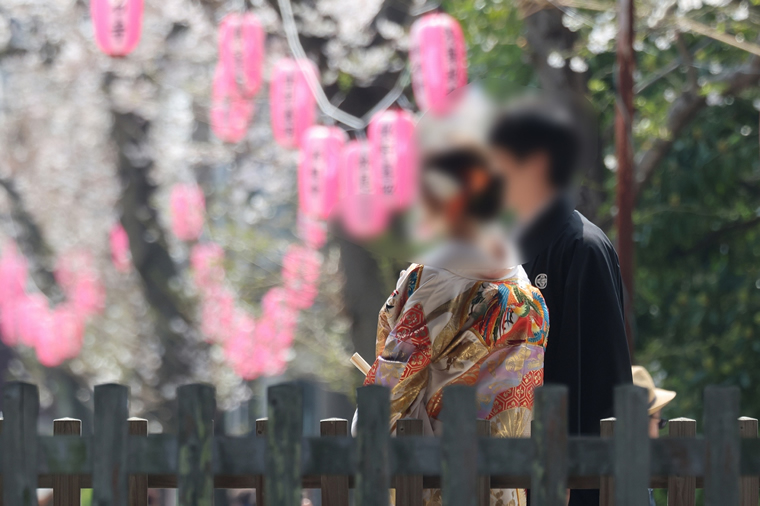 お寺の参道の桜と提灯を背景に、素敵なカップルの後ろ姿。