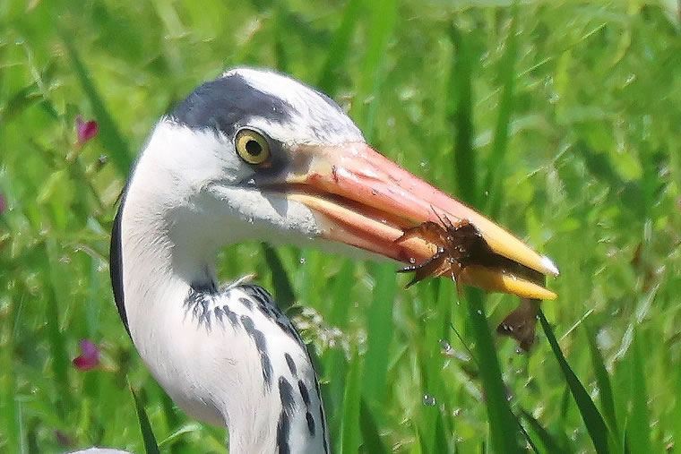 池の端で、獲物を探していたアオサギさん、大きなザリガニをゲットです!!