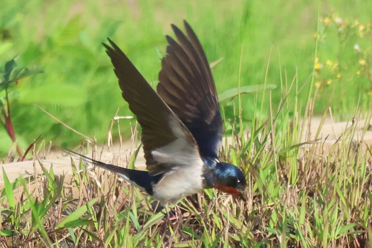 巣材の泥と藁を集めに、ツバメが次々にやってきます。