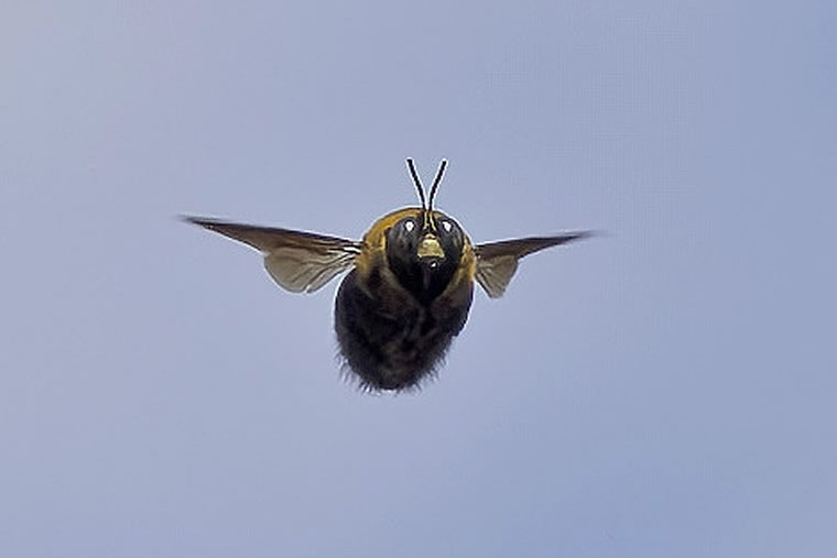 オスは「動くものがメスのクマバチかどうか」を近づいて確かめる習性があるため、人間でも動くものについてきますが、おとなしい性格で攻撃性は低いのとのこと!