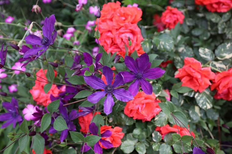 赤いバラとクレマチスの紫のコントラストが綺麗です。