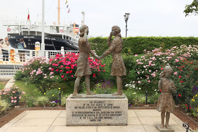 氷川丸の前に建つ日米友好ガールスカウトの像。