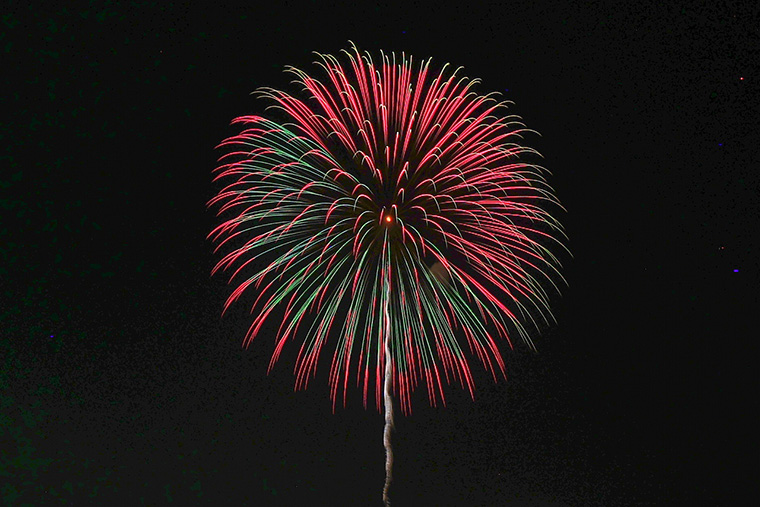 花火の下に見える白い筋が、花火が打上った直後からの花火の軌跡です。