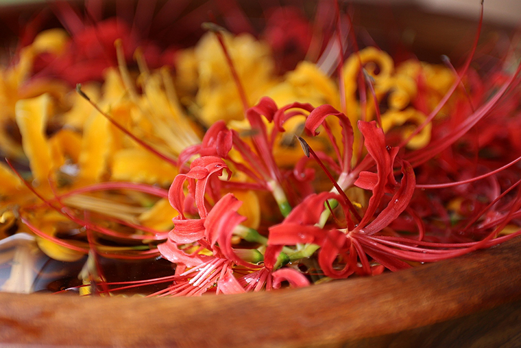 石段を登って山門に入ると、奥の手水舎の手水鉢の水面に綺麗な彼岸花が浮かべられていました。