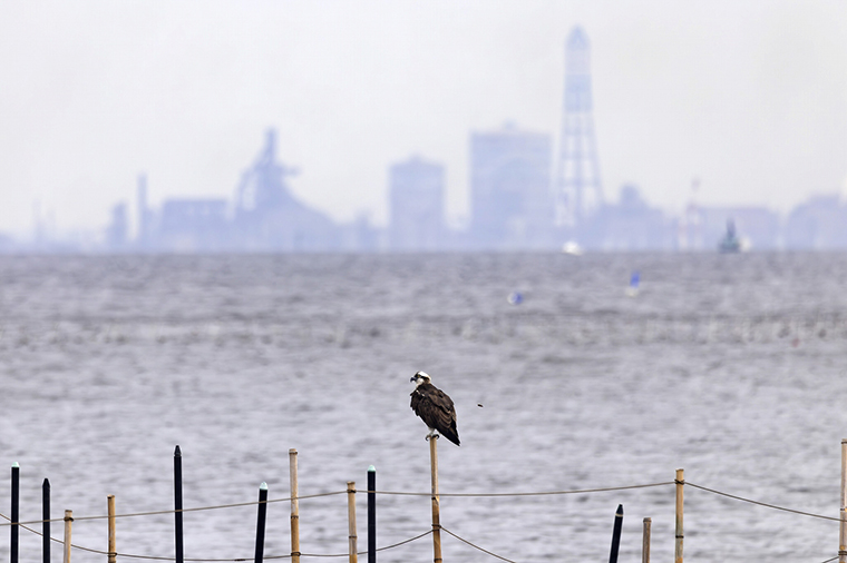杭留まりのミサゴの背景は、東京湾を挟んで房総半島 千葉県の富津火力発電所です。
