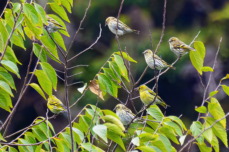 カメラのファインダー越しに、拡大して見ると、お目当てのマヒワの群れでした。
