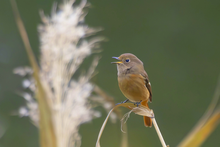 ジョウビタキのメスがススキに穂に留まってくれました。