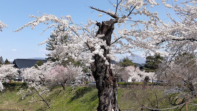 連休前か開け位に峠の桜が咲いて見納めという感じです。 画像は4月前半の鶴ヶ城。遠くに磐梯山が見えます。