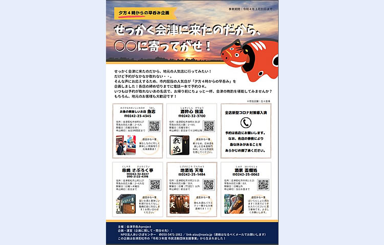ノンベな貴方に最高の企画です。 一気にコロナが下火になって、会津もドッと観光の人が増えました。 せっかく来たのに、お目当ての店が一杯で入れない~クヤシイ~。 なんて思いをしないために、少し早目に呑みませんか? 勿論、地元の方も大歓迎で~す。