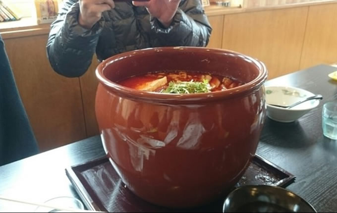 【一日一麺】 あれはいつのことだったか。。。 恐らく前世紀の終わり位だからもう20年以上も前。 何人かで東京にクルマで行って、帰りに東北道の佐野の辺りのサービスエリアに寄って、軽く何か食べようということになった(と思う)。 各自、思い思いのものを食べた気がしますが、何を食べたかは覚えていません。 しかし同行のUちゃんが食べたラーメンだけは未だに脳裏に焼き付いています。 よく味噌を入れておくような、デッカイ壺(つぼ)ってありますよね。 それに並々とラーメンが入ってて、5人前だとか。(1玉200gとすると1キロか!) 店のオバちゃんが、「お兄ちゃん、ドンブリ幾つ要るの?」と訊いたのは、これはファミリー向け。 大勢の家族で分け合って食べるそうで、まあ旅先の思い出作りのアトラクションイベント用か? それをUちゃんは「ドンブリ?要らねす。」と壺を抱えて一人で食べるから、周りからギャラリーが出来ちまった。 あのサービスエリアのラーメン、まだあるのかなとビジュアルを見たくなって探したのですが出てきません。 一番近いのを貼っておきます。