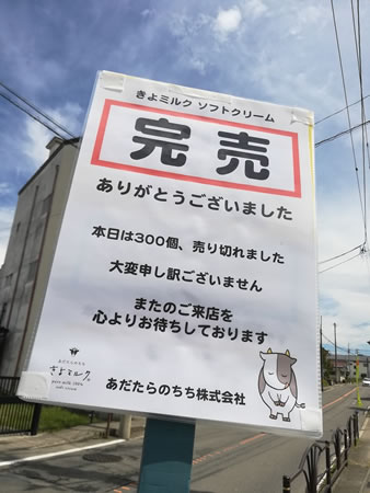 そこで昨年、奇跡が起きました。 旧い店舗を工場にしてソフトクリームを作っていた会社の商品がネットで火がついて、お客さんの大行列+クルマの大渋滞ができたんです. 元々が工場で、販売することなど考えていなかったので、もう収拾がつかなくなり、近くの住民センターの駐車場も満車で、皆さん、少し離れた金融機関の駐車場に停めて行列に並びだしたんです。 そしたら金融機関からクレームが来て、挙句の果てに駐車場の出入口をロープで塞がれてしまいました。 言っておきますが金融機関が休みの「土日」です。