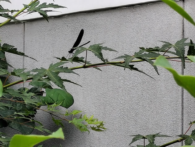 まったく浅学で、調べましたら「ハグロトンボ」という名前でした。 神様の使いといわれていて、神様トンボとも呼ぶそうな。 とても縁起がいいということなので、ズッと居てください。