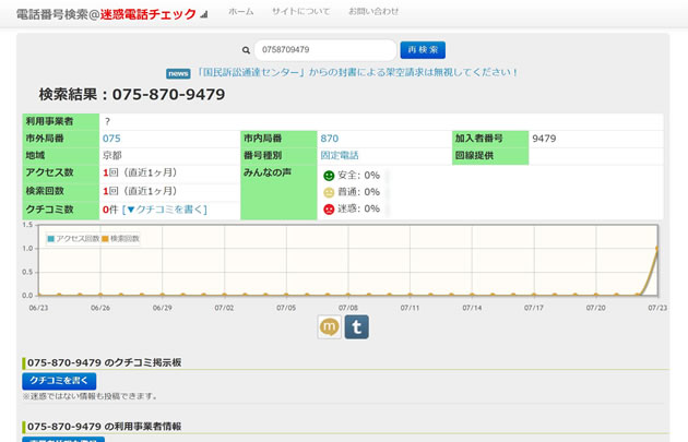 まあ、こちらは固定電話なので、そのままにしてたらどうなるかと思ってたら、同じメッセージを3度繰り返して相手から切れました。 これ「1」を押したらどうなったんでしょう。 なお相手の電話番号が表示されましたのでここに貼っておきます。 81758709479 81から始まるので日本国内ですね。 075-870-9479 になりますかね。 とすると京都か。。。