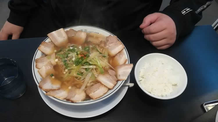 【一日一麺】今日のランチの相手は、会津の名居酒屋「酒家 盃爛処」の「Kちゃん」。Kちゃん、なにせ身体がデカい。ランチは空山の「葱麻辣麺 大盛り 肉盛り 白めし (写真には無いけど餃子付)」。器が小さいんじゃなくてKちゃんがデカすぎ。見ているだけでお腹がイッパイ。Kちゃん、おやつにビッグマックを2つ食べるそうな。