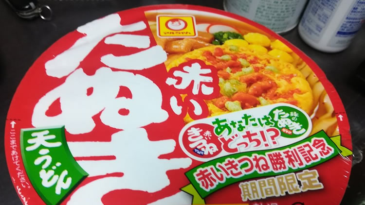 【一日一麺】 こんなもの発見。 この前「赤いきつねと緑のたぬきのどっちが好きか?」みたいなのをやって、赤いキツネが勝ったんですよね。 その結果の戦勝記念でしょう。