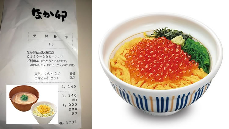 【初なか卯】 会津には「なか卯」が無いので、昨日仙台で初めて行ってみました。 入るとイキナリ自動販売機。 「あらら困った。こちとら株主優待券使用希望なのですが。。。」 カウンターにいたお姉さんに「すんません。株主優待使いたいんですが。」と言うと「はい。かしこまりました。オーナー様優待ですね!」 僅かばかりの株式なのにオーナー様と言われると気恥ずかしいですが、チャンと使えました。 国産イクラ丼にみそ汁、生野菜がついて70円。(レシートは豚汁と間違われてます。この後で70円の返金あり) この時期は、しばらく優待生活から抜けられません。 今日は吉牛行こうかと。
