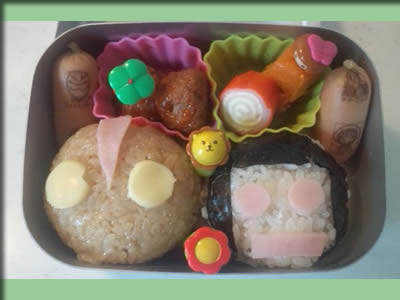2学期最初のおべんとは、 息子のリクエストでママとぼく。 ついでに父もまぜてあげました。 (撮影日時:2012年08月30日 06:52)