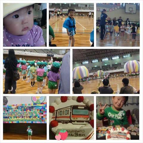 保育園の運動会☆去年は泣いて離れなかった次男坊も、 帰宅後、次男坊は転んで、おでこをザックリ流血(T-T) 集合時間を勘違いして、開始直前に滑り込みセーフ(-o-;) 親子競技、よさこい、リレー、パラバルーン、