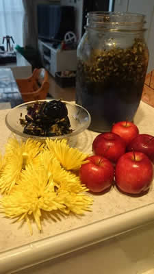 いただきものの こなすとシソの実を、秘伝の?タレでつけてみました。 そして、いただきものの、 菊の花と、姫りんご。