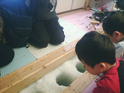 (お友達A) ワカサギ釣りって寒さと戦いながらすると思ってたんだけど、何、そのテントのようなものは?? もしかして寒さをしのぎながらできるのかな?なら、うちもチャレンジさせてみたい!