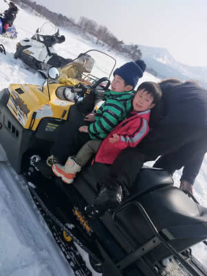 スノーモービルを楽しむさま。