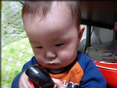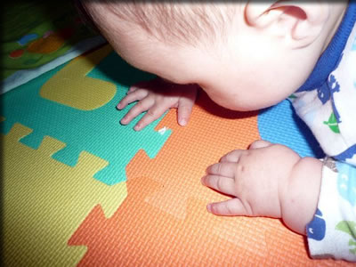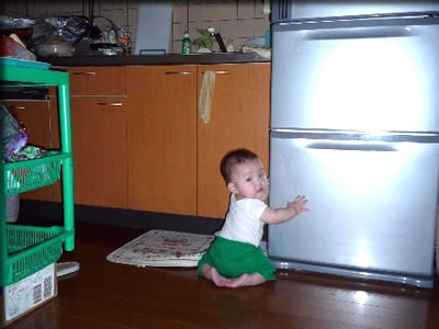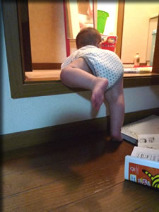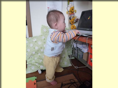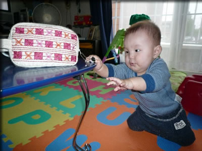 ◆2 獲物を狙う さて、8ケ月を迎えたひびさんですが、 10月6日、机につかまり座りをするようになった。 獲物を狙う目はオトコノコってカンジ。