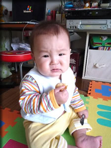 ◆9 不機嫌の理由 どうやら、上の歯の生え始めで機嫌が悪かったようで、 こうやって、いろんな壁を乗り越えながら、