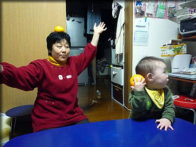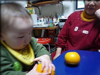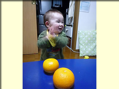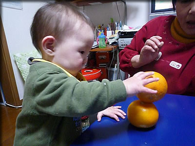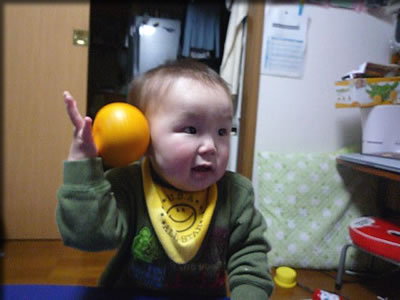 ◆4 あたまにのせて ほっ! ひびちゃん、見て! あたまにのせてごらん はっさくハッスルばぁたん。~!