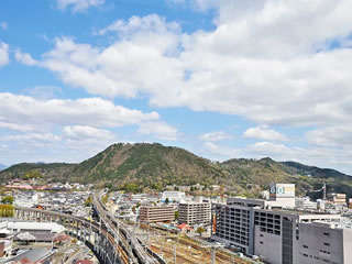 社宅(左側)から見た桜の時期の上田城跡公園(筆者提供)